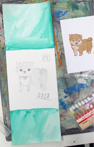 こちらはかわいらしいイラストの犬にしました。丸い感じがほんわかしますね♪次回、着彩して完成させたいと思ってますよ〜。