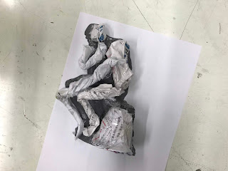 ロダンの摸刻。新聞紙などで、中の骨の部分を作りました。腕や足の角度や形が難しいところですが、こうして並べると、あのポーズが見えてきますね!次回は組みたてていきましょう!